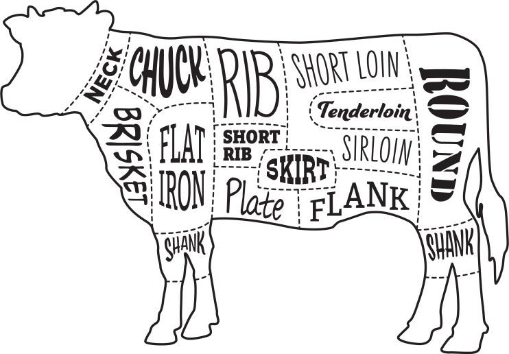 Neck Chuck Brisket Flat Iron Rib Short Rib Short Loin & Sirloin Short Loin & Sirloin Short Loin & Sirloin Tenderloin Skirt Plate Flank Round Fore Shanks Hind Shanks